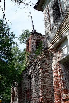 Снова видим развалины. Видимо, благотворители вместе с представителями церкви (а вот здесь всё по благословлению - не так давно открывать новую церковь во имя св. пророка Илии приезжал сам архиепископ Вологодский и Великоустюгский Максимилиан) решили, что восстановить каменные здания церквей невозможно или нецелесообразно, поэтому построен небольшой деревянный храм.